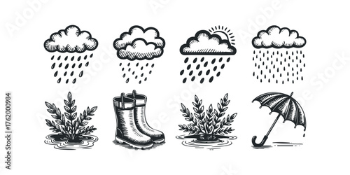 Rainy weather icons featuring clouds, boots, and umbrella