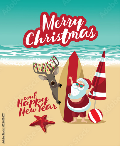 Summer Santa Claus Christmas day July.Delivery service concept cute cartoon character for Xmas design on sea wave water background.Creative paper cut and craft style.web minimal vector illustration
