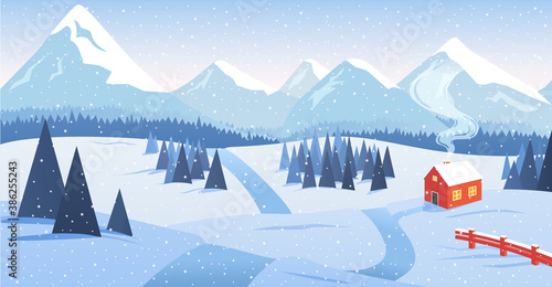 Winter landscape. Vector illustration of forest landscape with winter house, snowman, pines, snowy mountains, Christmas trees. Small village in Xmas day. Happy Holidays greeting card, postcard