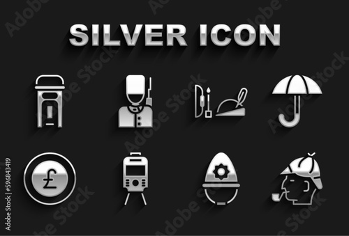 Set line Four leaf clover, London mail box, Sherlock Holmes, phone booth, Pound sterling money, Cup of tea with tea bag, British soldier and Flag England icon. Vector
