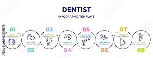 Dentistry infographic template, elements and icons. Infograph includes customizable graphs, charts, line icon set with dentist tools, dental care, tooth decay, teeth health, medicine chest etc.