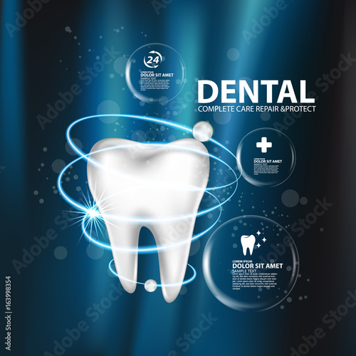 Set of dental white teeth, 3d models dental examination teeth, whitening and repair. Realistic vector illustration isolated on blue background
