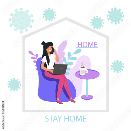 Vector illustration with a girl sitting at a computer and leaves on a white background.  Stay home. Coronavirus concept