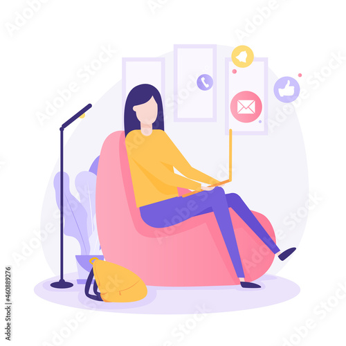 Young woman with laptop sitting on a Chair. Concept of freelance, telework, distance job,temporary isolation. Prevention of coronavirus. Stay at home. Flat vector illustration.