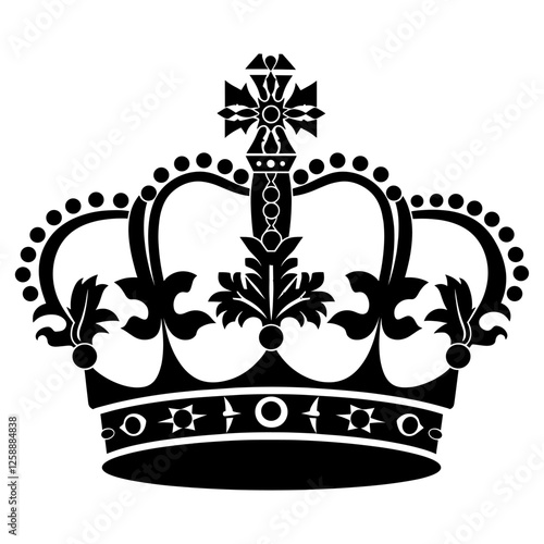 Ornate Black and White Crown Illustration with Fleur-de-lis and Cross Detail Keywords: crown, royal, monarchy, king, queen, royalty, symbol, emblem, heraldry, crest, regalia, sovereign, imperial