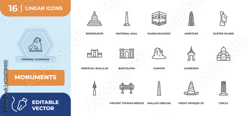 monuments infographic template with icons and 6 step or option. monuments icons such as national mall, notre dame cathedral, stari most, segovia aqueduct, qutb minar in new delhi, imperial guardian