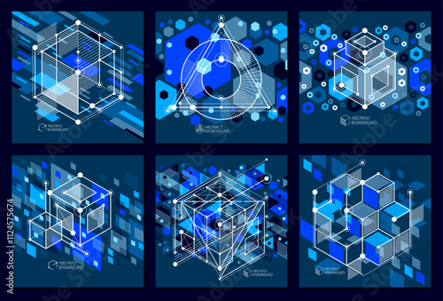 Vector drawings set of blue black industrial system created with lines and 3D cubes. Modern geometric composition can be used as template and layout.