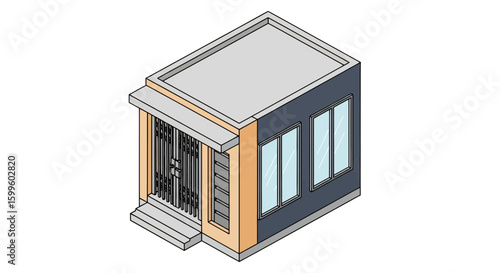 Isometric vector illustration of an accessible building entrance. Features a wheelchair ramp, stairs, and elevator. Universal design and disability inclusion concept