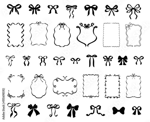 Set of wavy and quirky abstract vintage bow frames. Vector hand drawn outline illustration of ribbon bowknots. Cliparts for valentine's day, birthday, wedding, christmas designs