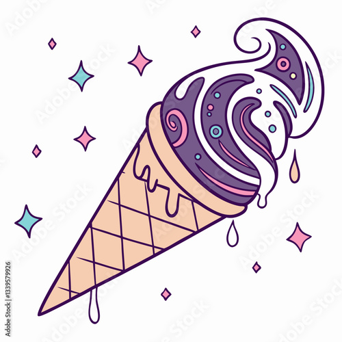 Cute mermaid ice cream cone with a seashell on top, cartoon illustration.