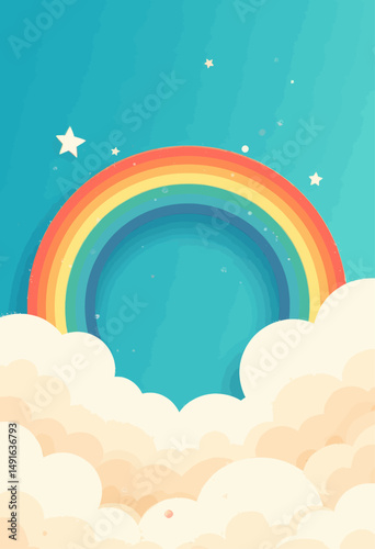 A pastel-colored rainbow arch with fluffy clouds at both ends, set against a night sky with small glowing stars. A round, sky blue platform is placed in the center below the rainbow.