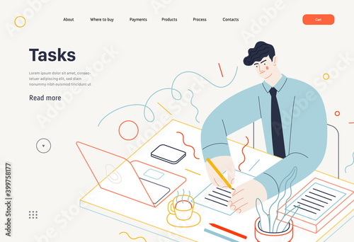 Man sitting by table and typing on laptop. Person work as secretary and doing tasks from people. Manager busy at his workplace, lot of work at office. Vector illustration of working day in flat style