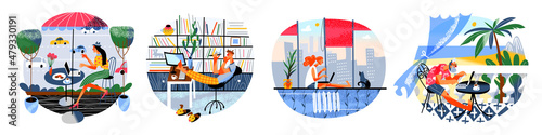 Remote work of people set, busy characters telecommuting in flexible working hours
