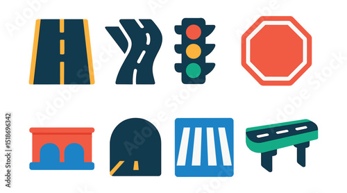 Road Overpass Crossroad Roundabout Minimalistic Flat Line Circle Solid Stroke Icon Pictogram Symbol Set Collection