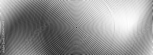 Black concentric circle background. Radial geometric pattern wallpaper. Line epicenter, radar or target concept. Round rippled ring backdrop for brochure, banner, poster, overlay. Vector texture