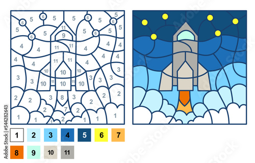 Vector coloring page, Puzzle game, Color by number rocket, shuttle, spaceship
