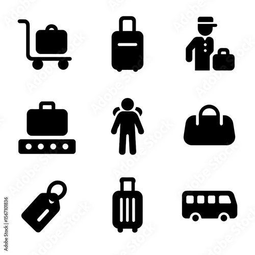 49 Travel icons, luggage symbols, suitcase designs, backpack illustrations, trolley bag outlines, carry-on luggage, travel accessories, airport security icons, baggage claim symbols, vacation packing