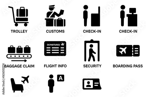 Solid style icons of airport and flight experience: check-in counter, baggage claim, flight screen, security gate, customs icon, overhead bin, seatbelt sign, window view.