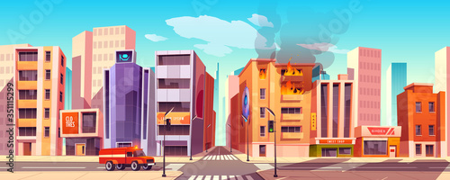 Fire in city house and fire truck on town road. Vector cartoon urban landscape with burning building, flame with black smoke and red emergency rescue vehicle