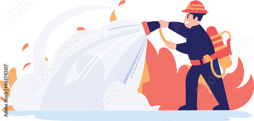 Hand Drawn Firefighter character extinguishing fire in flat style