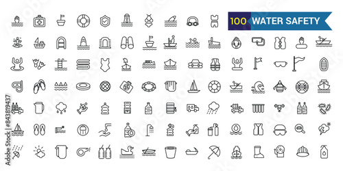 Water safety training icons set outline vector. Beach assistance. Outline icon collection. Editable stroke.