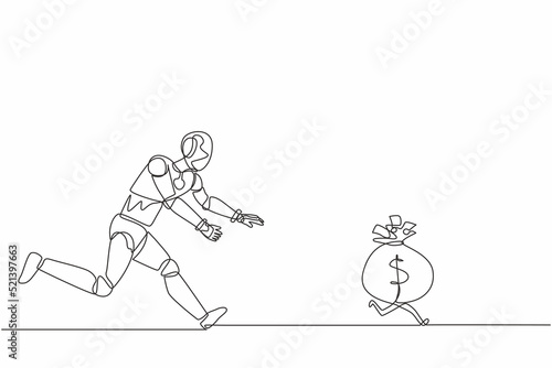 Single continuous line drawing robot chasing money bag dollar run away. Modern robotic artificial intelligence. Electronic technology industry. Dynamic one line draw graphic design vector illustration