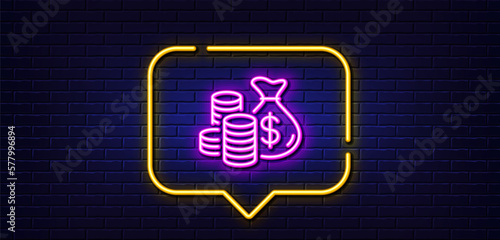 Neon light speech bubble. Coins bag line icon. Cash money sign. Income savings symbol. Neon light background. Coins bag glow line. Brick wall banner. Vector