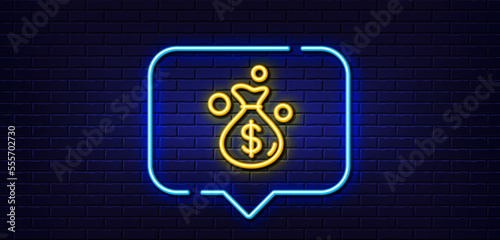 Neon light speech bubble. Money bag line icon. Cash coins sign. Income profit symbol. Neon light background. Money bag glow line. Brick wall banner. Vector