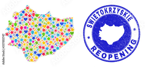 Celebrating Swietokrzyskie Voivodeship map mosaic and reopening rubber stamp seal. Vector mosaic Swietokrzyskie Voivodeship map is constructed with scattered stars, hearts, balloons.