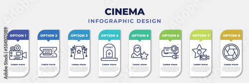 infographic template with icons and 8 options or steps. infographic for cinema concept. included film viewer, theater ticket, red carpet, cinema ticket window, cinema celebrity, projector with plug,