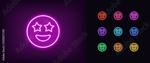 Outline neon star emoji icon. Glowing neon superstar emoticon with starry eyes, star struck face pictogram. Wow effect
