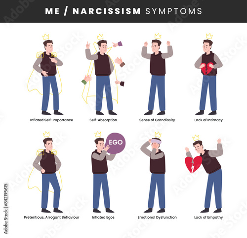 Narcissism symptoms infographic medical poster design, labeled including inflated egos sense of grandiosity pretentious arrogant lack of intimacy and empathy self absorption, Narcissistic Self Love.
