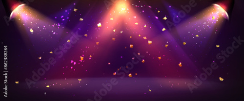 Neon spotlight stage background. Disco party projector light concert or show scene. Magic beam glow for nightclub or award winner with confetti glitter. Congratulation performance for celebrity