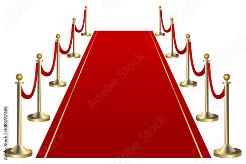 Editable perspective vector of Stanchions with Velvet Ropes. Elegant Red Carpet. Isolated on a White Background for VIP Events.