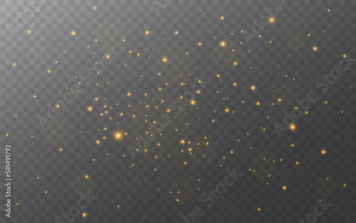 Gold glitter. Magic glowing elements. Bright golden sparks and bokeh. Abstract stardust effect. Glowing particles for banner or poster. Vector illustration
