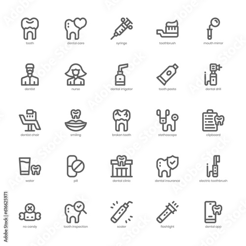 Vector graphic set. Icons in flat, contour, thin and linear design. Dental services, therapy, disease, problem, tool, reconstruction. Simple isolated icons. Concept Web illustration. Sign, symbol.