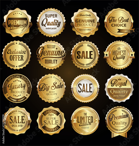 Collection of vintage retro premium quality golden badges and labels