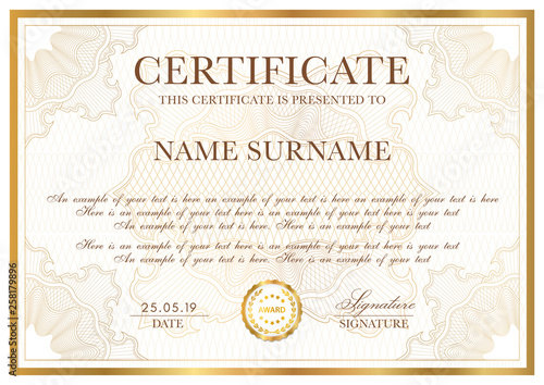 Certificate template with abstract line pattern and gold frame on black background. Vector stripe design for Diploma, certificate of appreciation or award