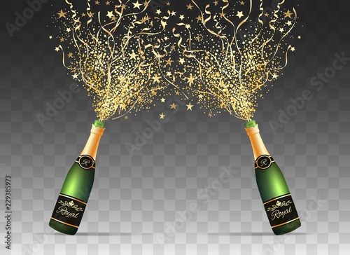 Two champagne glasses with champagne bottle explosion. Cheers. Celebration. Holiday toast.