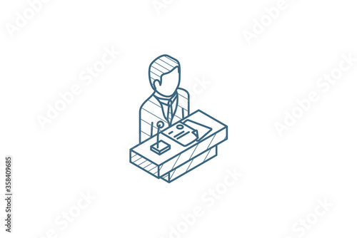 businessman conference, lecture, politics speaker isometric icon. 3d line art technical drawing. Editable stroke vector