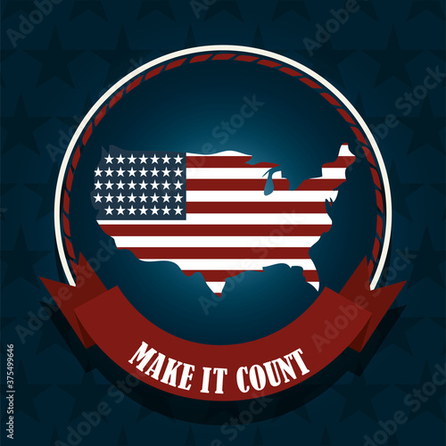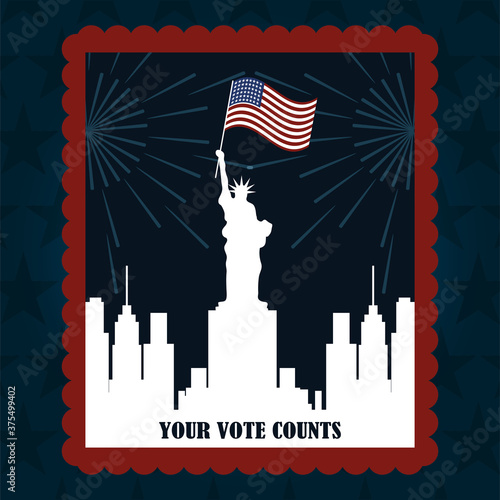 silhouette NY city with flag post stamp, politics voting and elections USA, make it count