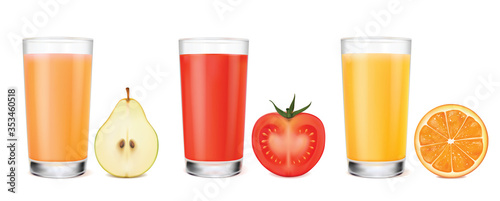 Fresh Fruit Juices in Glass, Vector Illustration Set.