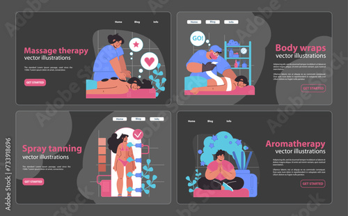 Massage therapy icon set with table, oils, stones, towel, candle, and accessories