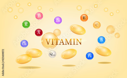 Vitamin C bubble background collagen serum pill drop icon. Skin vector health acid yellow vitamin c concept.