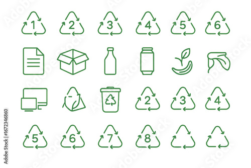 Recycling logo icons, green recycle symbols, eco-friendly design, sustainability vector, waste management sign, circular arrows, reusable materials, environmental awareness illustration