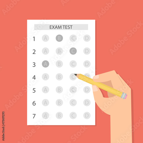 The student filling out answers to exam test answer sheet with a pencil. School and Education. Test score sheet with answers