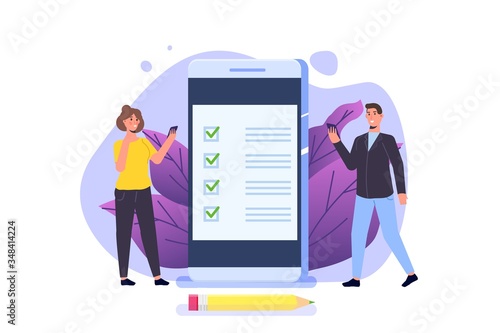 Concept of online exam on smartphone or computer. Online exam, opinion checklist, online education, questionnaire form, survey metaphor, answer internet quiz. Flat vector illustration.