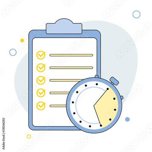 Timing concept with clock and checklist on clipboard. Paper test with timer, checklist, exam concept illustration flat design