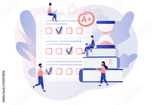 Exam concept. Tiny students with test exam result. Education, studying, Digital elearnning, degree, graduate concept. Modern flat cartoon style. Vector illustration on white background