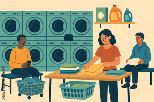 A modern industrial laundromat featuring automatic washing and drying machines, depicted in a colorful flat vector illustration, where people gather